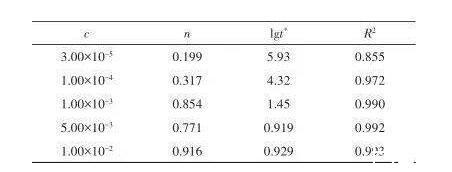 圖4展示了不同SDBS濃度下lg S隨lg t的變化規(guī)律,圖中實線對應各濃度下動態(tài)表面張力的擬合曲線,此時圖中時間t的單位為ms。從圖中可以看出,擬合結果與實驗數(shù)據(jù)吻合較好,擬合曲線能夠較好地表征動態(tài)表面張力的時間演變趨勢。擬合得到的系數(shù)見表1。