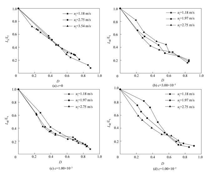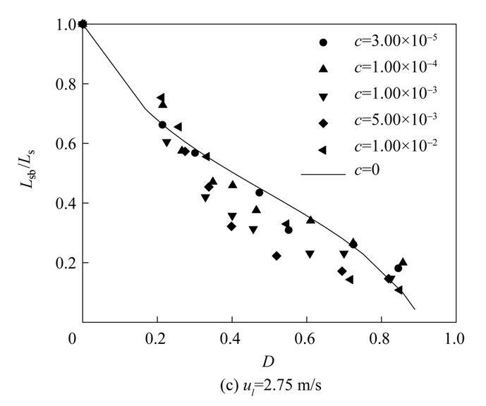 如圖12所示,當氣泡直徑較大時,破裂長度比基本不隨射流速度的改變而改變。這是由于此時氣泡引起的射流速度擾動對射流破裂的影響占主導地位。在氣泡直徑較小時,當表面活性劑濃度c<1.00×10-2,不同射流速度下射流破裂長度比基本相同。當表面活性劑濃度c=1.00×10-2,破裂長度比隨著射流速度的增大而逐漸減小。這可能與被削弱的Marangoni效應有關。由式(10)可知,液體射流速度越大,液體對流造成的表面活性劑表面吸附量減少的趨勢越強,波峰波谷間的表面張力差值越小,Marangoni效應越弱,射流破裂長度增加的趨勢越弱。因此,在氣泡較小時,隨著射流速度的增大,含氣泡射流的破裂長度比逐漸減小。在表面活性劑濃度較小時,氣泡的存在進一步減小了射流內(nèi)部表面活性劑的濃度,從而使得不同射流速度下Marangoni效應的差別不明顯,不同射流速度下射流破裂長度比基本相同。