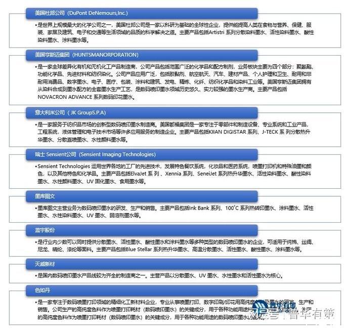 數(shù)碼噴印墨水市場呈現(xiàn)與數(shù)碼印花設(shè)備市場相近的市場競爭格局,由海外巨頭主導(dǎo)市場,如美國杜邦公司、美國亨斯邁集團(tuán)、意大利JK公司等。從全球范圍來看,目前歐洲、北美地區(qū)的數(shù)碼噴印技術(shù)仍處于較高水平,是率先對數(shù)碼噴墨印花技術(shù)實(shí)現(xiàn)產(chǎn)業(yè)化的地區(qū),受益于較高的環(huán)保標(biāo)準(zhǔn)和豐富的時(shí)尚原創(chuàng)設(shè)計(jì)產(chǎn)業(yè),歐洲、北美地區(qū)的數(shù)碼印花產(chǎn)品供需旺盛,數(shù)碼噴印應(yīng)用產(chǎn)業(yè)規(guī)模大且普及程度高,全球領(lǐng)先的數(shù)碼噴印墨水制造商多集中于此,亞太地區(qū)則以日本、韓國制造商為主。我國的數(shù)碼噴印墨水行業(yè)起步較晚,企業(yè)規(guī)模、研發(fā)能力以及產(chǎn)品穩(wěn)定性等方面參差不齊,且主要以中小型企業(yè)為主,但隨著最近幾年國產(chǎn)數(shù)碼噴印墨水的快速發(fā)展,我國也出現(xiàn)了少數(shù)綜合實(shí)力相對較強(qiáng)的專業(yè)生產(chǎn)商。國內(nèi)外主要墨水生產(chǎn)商情況如下:
