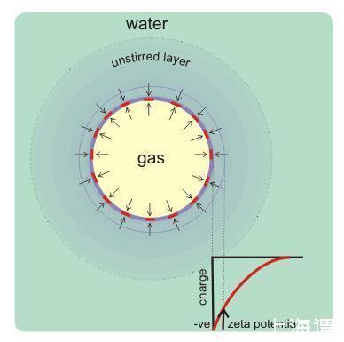 納米氣泡也存在比較強的靜電場,能避免氣泡發生融合,對抗浮力作用。在水平電場中,氣泡電荷決定于水平速度v=ζε/μ(v=水平速度,ζ=zeta電位(V),ε=水的介電常數(s2×C2×kg-1×m-3),μ=粘滯度(Pa×s).)