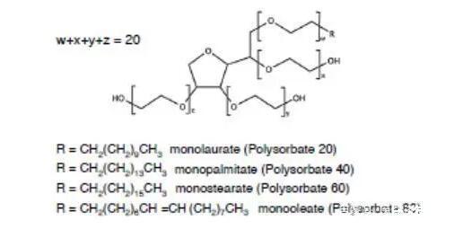 吐溫(Tween或polysorbate)也是一類較為常用的非離子表面活性劑。脫水山梨醇作為中心結(jié)構(gòu),四條PEG鏈段的一端連接在中心單元上。其中一條PEG鏈段的末尾連接脂肪長(zhǎng)鏈。吐溫常見的型號(hào)一般為吐溫20、吐溫40、吐溫、60和吐溫80,這些表面活性劑中,PEG的重復(fù)單元數(shù)目總數(shù)為20,而PEG末端連接脂肪酸長(zhǎng)鏈包括月桂酸、棕櫚酸、硬脂酸和油酸。隨著脂肪鏈長(zhǎng)度的增加,疏水結(jié)構(gòu)的占比增加,HLB下降,但是吐溫是水溶性表面活性劑,這幾個(gè)吐溫的HLB通常都在15以上。吐溫通常用于微乳、自乳化系統(tǒng)和固體分散體中。如果將吐溫中的PEG鏈段去除或替換成脂肪長(zhǎng)鏈,則得到了另一類表面活性劑,司盤。這是一類非水溶性表面活性劑,HLB通常小于10。