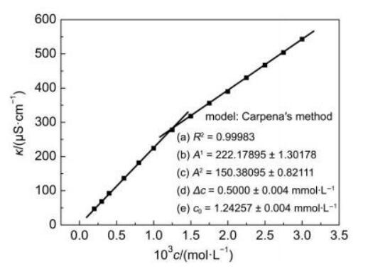 測量原理:利用電導率測定儀測量不同濃度表面活性劑水溶液的電導值(也可換算成摩爾電導率)。對于離子型表面活性劑,當溶液濃度很稀時,電導的變化規律與一般強電解質相似,表面活性劑完全解離為離子,隨著濃度上升,電導率K近乎線性上升但當溶液濃度達到臨界膠束濃度時,隨著膠束的形成,膠束定向移動速率減緩,K仍隨著濃度增大而上升,但變化幅度變小。摩爾電導率λm也急劇下降,利用K-C曲線的轉折點求CMC值(圖4所示)。