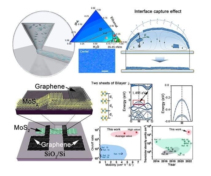二維(2D)半導體材料為將摩爾定律擴展到原子尺度提供了機會。與傳統(tǒng)基于蒸鍍和光刻技術(shù)的加工技術(shù)相比,印刷電子因成本效益、靈活性以及與不同襯底的兼容性而受到關(guān)注。目前,印刷的二維晶體管受到性能不理想、半導體層較厚和器件密度低的制約。同時,多數(shù)二維材料油墨通常使用高沸點溶劑,隨之而來的問題包括器件性能退化、高材料成本和毒害性等,難以大規(guī)模應用。因此,發(fā)展簡單且環(huán)保的策略對于制造低成本、大規(guī)模的打印二維材料功能器件具有重要意義。