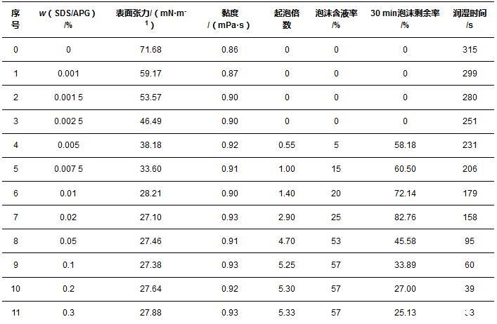 2)在SDS和APG構成的表面活性劑體系中,溶液表面張力的降低,有利于起泡、泡沫攜液、泡沫穩定性和潤濕能力的提升。當質量分數大于cmc時,表面張力幾乎不變;在測定范圍內,隨著質量分數增加,溶液起泡能力呈現先增加后平穩的趨勢,泡沫穩定性降低,潤濕性能提升。