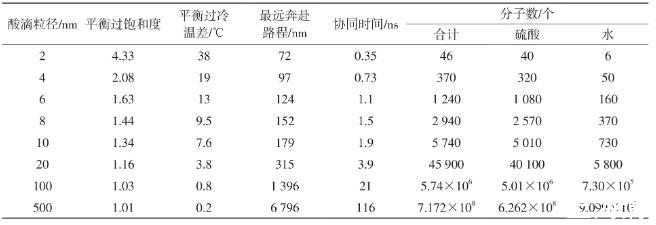 若冷凝酸初始粒徑為8 nm,由2 940個分子組成,平衡過飽和度1.44,酸滴表面飽和蒸氣壓增大44%,對應的平衡過冷溫差9.5℃。在超額過飽和溫差10.5℃下,等于氣相過冷了約20℃,平衡過飽和度、超額過飽和度各半,此時酸滴中分子最遠奔赴路程150 nm,對應的協同時間是1.5 ns,酸滴間最近距離是0.3μm。