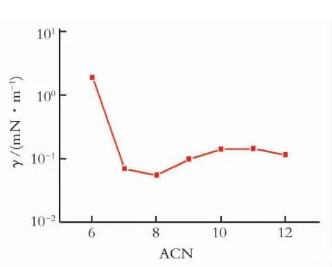 從圖2與表1可以看出,同樣條件下,甜菜堿與正構(gòu)烷烴間的界面張力遠(yuǎn)低于原油,說明油相性質(zhì)對油水界面張力有關(guān)鍵的影響,可能是原油中降低界面張力能力不如甜菜堿的活性組分分子在界面上的存在造成原油界面張力較高。