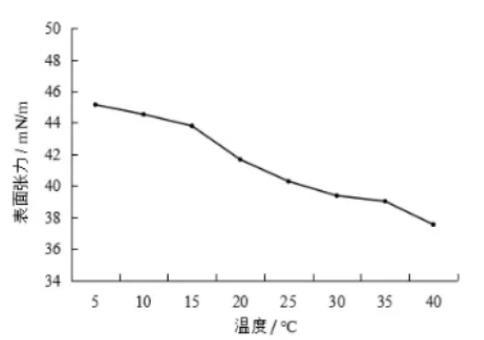 由圖1可以看出合成血液表面張力隨著溫度的升高而減少,從原來的45.149mN/m降至37.540mN/m。因?yàn)殡S著溫度升高,分子鍵引力減弱,表面張力隨溫度升高而減少。同時(shí),溫度升高,液體的飽和蒸氣壓增大,氣相中的分子密度增加,氣相分子對液體表面分子的引力增大,導(dǎo)致液體表面張力減少。