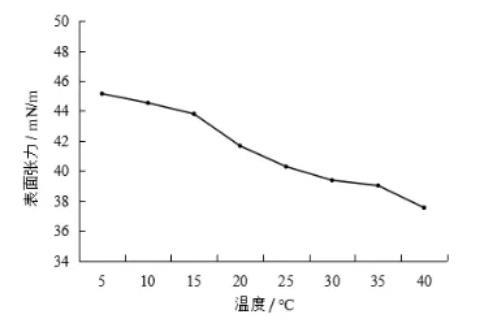 由圖1可以看出合成血液表面張力隨著溫度的升高而減少,從原來的45.149mN/m降至37.540mN/m。因?yàn)殡S著溫度升高,分子鍵引力減弱,表面張力隨溫度升高而減少。同時(shí),溫度升高,液體的飽和蒸氣壓增大,氣相中的分子密度增加,氣相分子對(duì)液體表面分子的引力增大,導(dǎo)致液體表面張力減少。