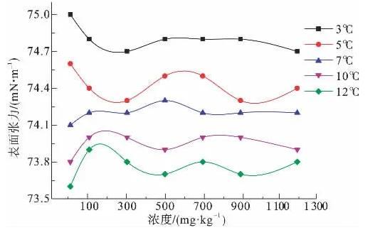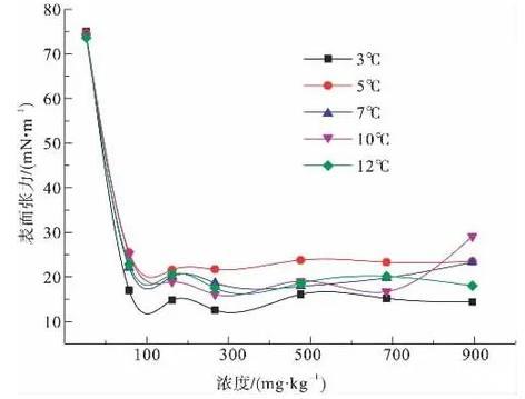 圖6為100、200、300、500、700、900 mg/kg濃度下,非離子表面活性劑P123溶液的表面張力隨溫度變化示意圖。由圖6可知,隨濃度增大,溶液降低表面張力的能力逐漸增大,但各個濃度曲線差值不大,900 mg/kg濃度溶液表面活性最強。在所測溫度范圍內,整體上表面張力曲線幾乎呈直線狀,遵循隨溫度升高而表面張力降低的一般規律,斜率幾乎不變,未出現拐點,且相差較大,同一條曲線3℃和12℃表面張力值相差4.2~4.6 mN/m。