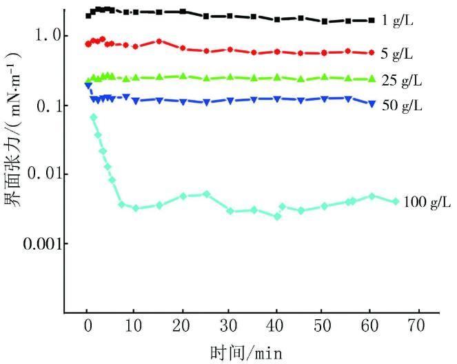 為了選擇合適界面張力體系來進(jìn)行驅(qū)油實驗,實驗室內(nèi)配置了礦化度分別為1,5,25,50,100 g/L,質(zhì)量分?jǐn)?shù)為0.2%的9AS-3-0溶液,并對其與原油之間的界面張力進(jìn)行了測量。實驗結(jié)果見圖1。