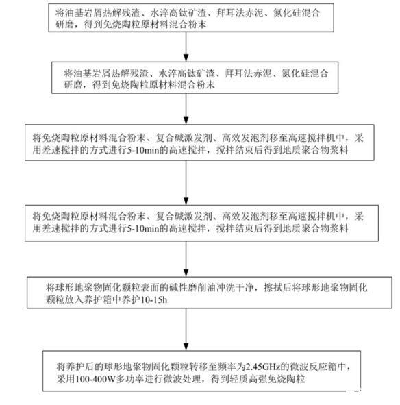 本發明一種油基巖屑-高鈦礦渣-赤泥基輕質高強免燒陶粒及其制備方法,本發明使用油基巖屑熱解殘渣、水淬高鈦礦渣、拜爾法赤泥作為免燒陶粒的主要原材,能夠促進其地質聚合反應的發生,增強對油基巖屑殘渣內重金屬離子的固化;